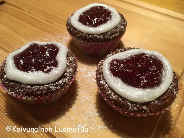 Anna torttujen jäähtyä 5-10 minuuttia ja koristele sen jälkeen vadelmahillolla ja tomusokeritahnalla.